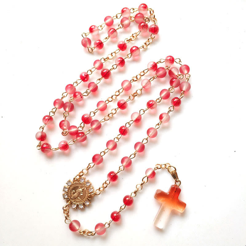 Premium Beads: The rosary features vibrant pink and translucent red beads that are both robust and elegant. These beads add a unique glow to your meditation experience, enhancing your connection to your faith.