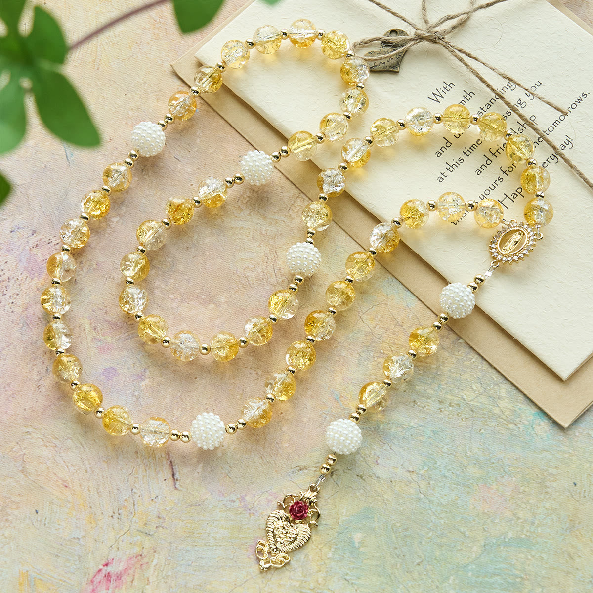 The golden-hued glass beads, like droplets of faith, flow toward the Our Lady of Guadalupe center and sacred heart pendant, anchoring each prayer in divine reverence. It merges glass elegance with sacred symbolism, celebrating the beauty of spiritual devotion. -