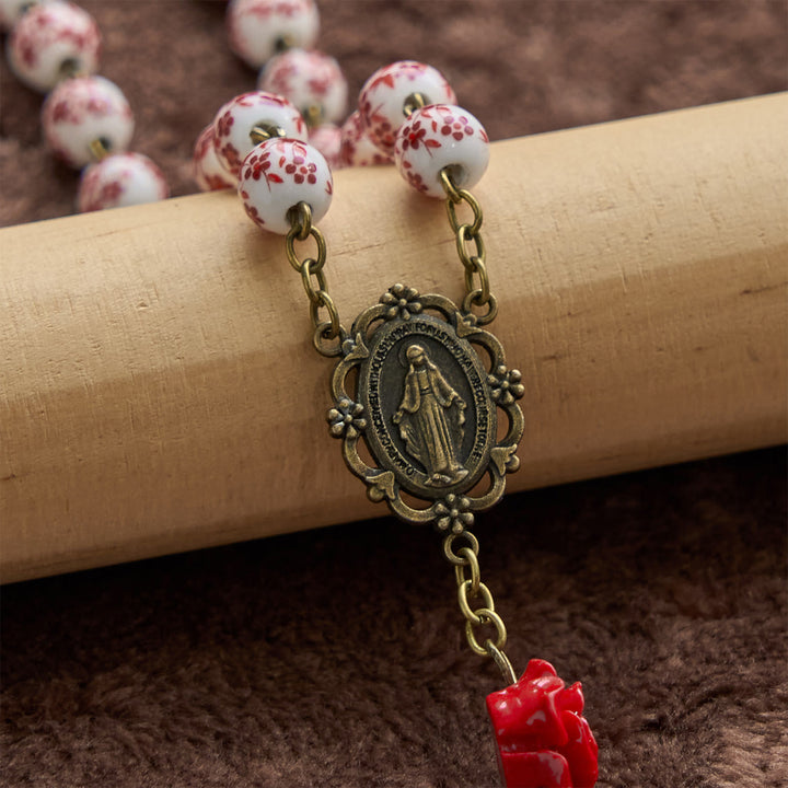 Miraculous Medal & Crucifix of 8mm Ceramic Beads & Rose Cinnabar Beads Handmade Rosary