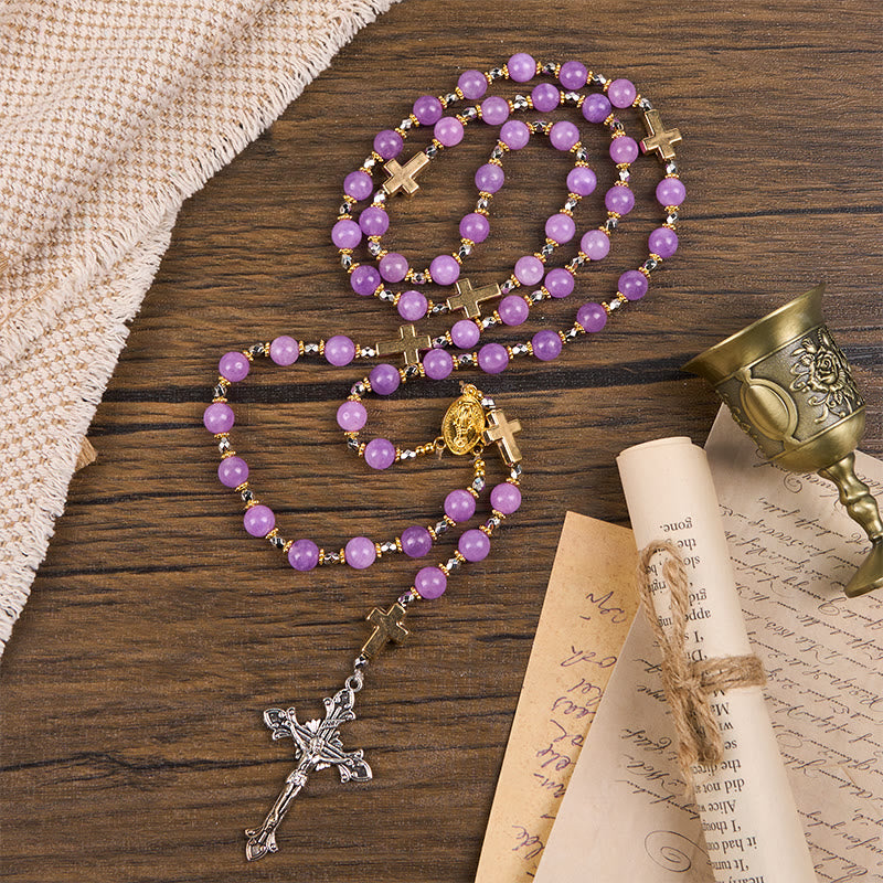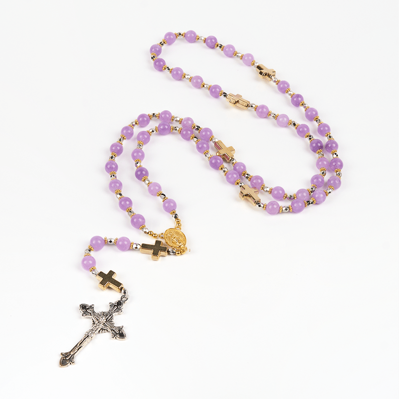 Interspersed with the lavender beads are radiant golden spacers, representing the glory and divinity of Christ. These accents add an element of beauty and reverence, making your prayer experience even more profound and rich in meaning. -
