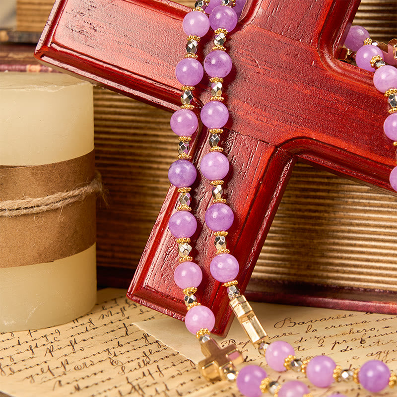The calming lavender beads symbolize serenity, devotion, and spiritual harmony. As you move from bead to bead, let the gentle hue remind you of the peace and love of Christ that surrounds and fills your heart. -