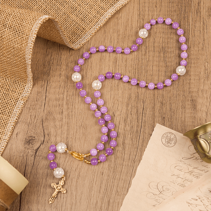 Complementing the amethyst are the clear crystal beads, symbolizing purity and clarity. These beads serve as a reminder of Christ's pure love and the unending grace of God. Each clear bead provides a moment of reflection, allowing you to feel closer to the Lord during your devotions.