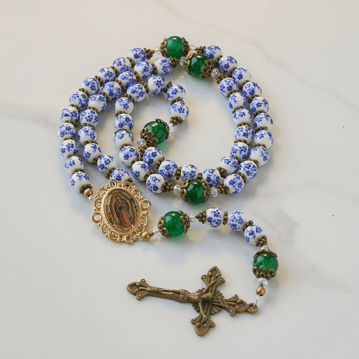 Divine Serenity Handmade Floral Rosary: Our Lady of Guadalupe & Crucifix of 8mm Ceramics&Jade