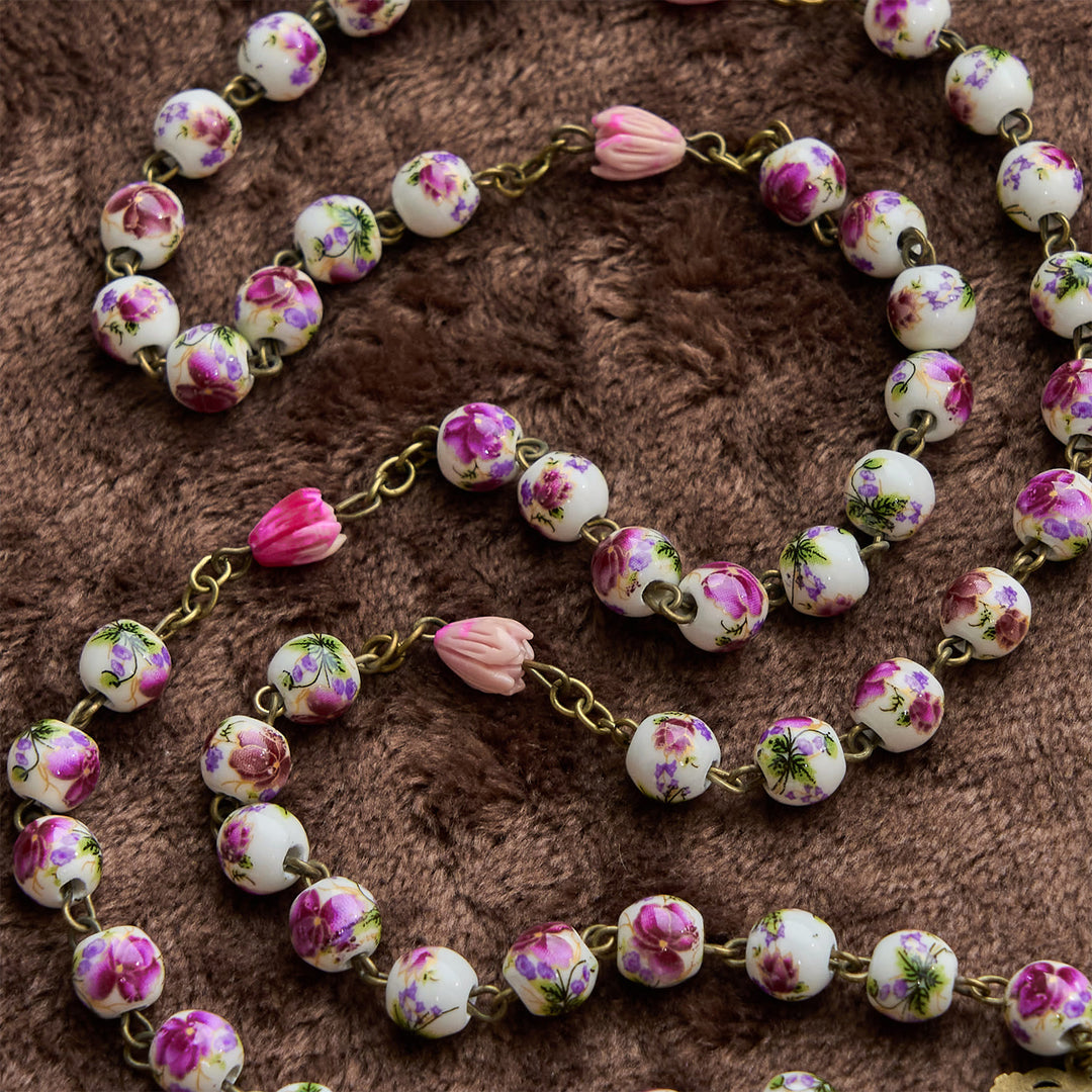 The rosary showcases ceramic beads, each adorned with intricate floral designs. Their smooth surface offers a tactile and comforting sensation as you move through your prayers. The ceramic material, with its refined elegance, imparts a timeless charm to your act of worship.