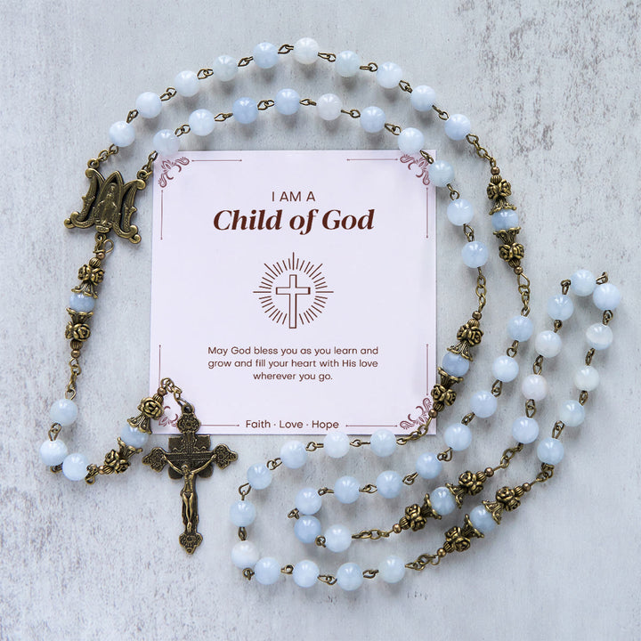 Rosary with Light Blue Jade Beads and Brass - Toned Accents: Your Path to Divine Communion
