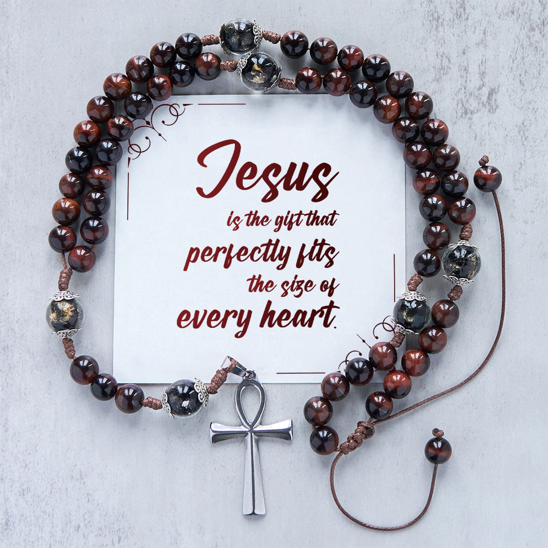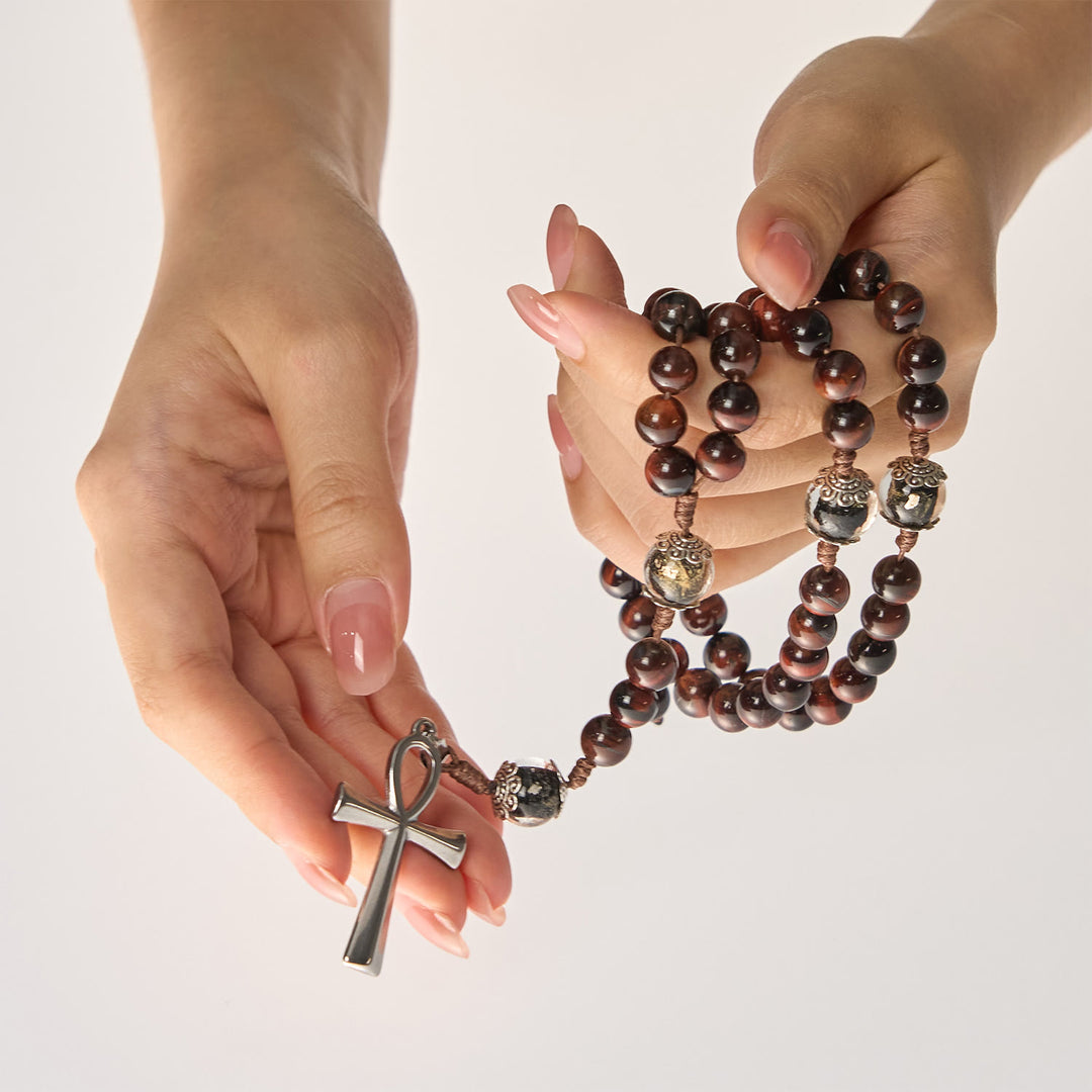 This Rosary & Necklace 2-in-1 is a versatile testament to enduring faith. The rich wooden beads, strung with care, hold the warmth of spiritual tradition, while the adjustable design ensures seamless transformation from a prayer - ready rosary to an elegant necklace. The Ankh cross, a symbol of eternal life and divine connection, is crafted with sleek metalwork, its form echoing age-old religious narratives. Every bead and the Ankh charm carries deep spiritual meaning, a beautiful trace of faith that connects the wearer to sacred traditions—whether in prayer or as a daily style statement.