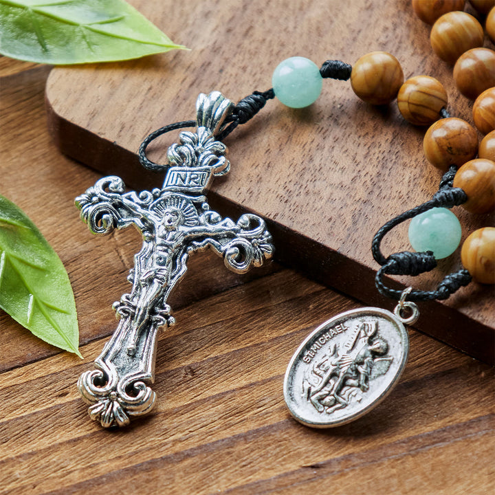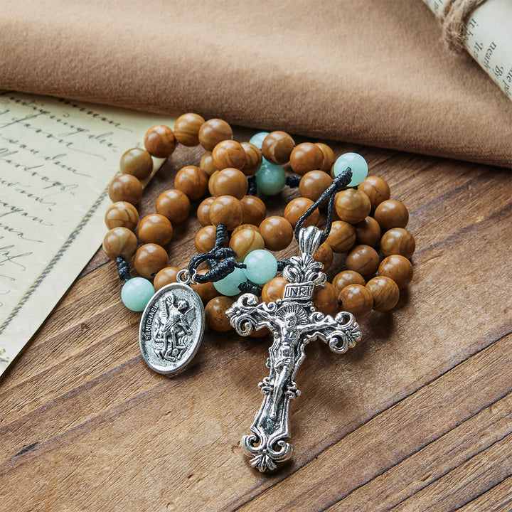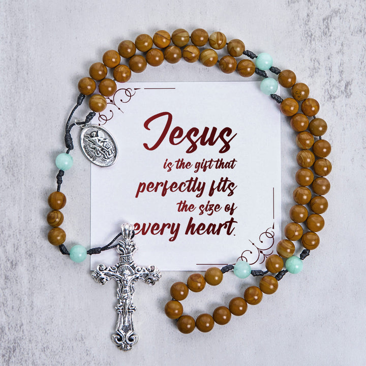 This rosary is more than beads—it’s Michael’s shield in mint, Christ’s crown in woodgrain brown, a sacred pact resting in the palm.