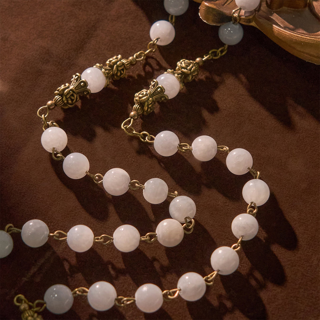 Each white bead on this rosary is a stepping - stone to the divine. Smooth to the touch, they invite you to pause, to breathe, and to enter into prayer. As your fingers glide over them, it’s a physical connection to the sacred, a way to quiet the noise of the world and focus on Christ. These beads are not just objects; they are catalysts for spiritual awakening, helping you open your heart to God’s presence with every count. -