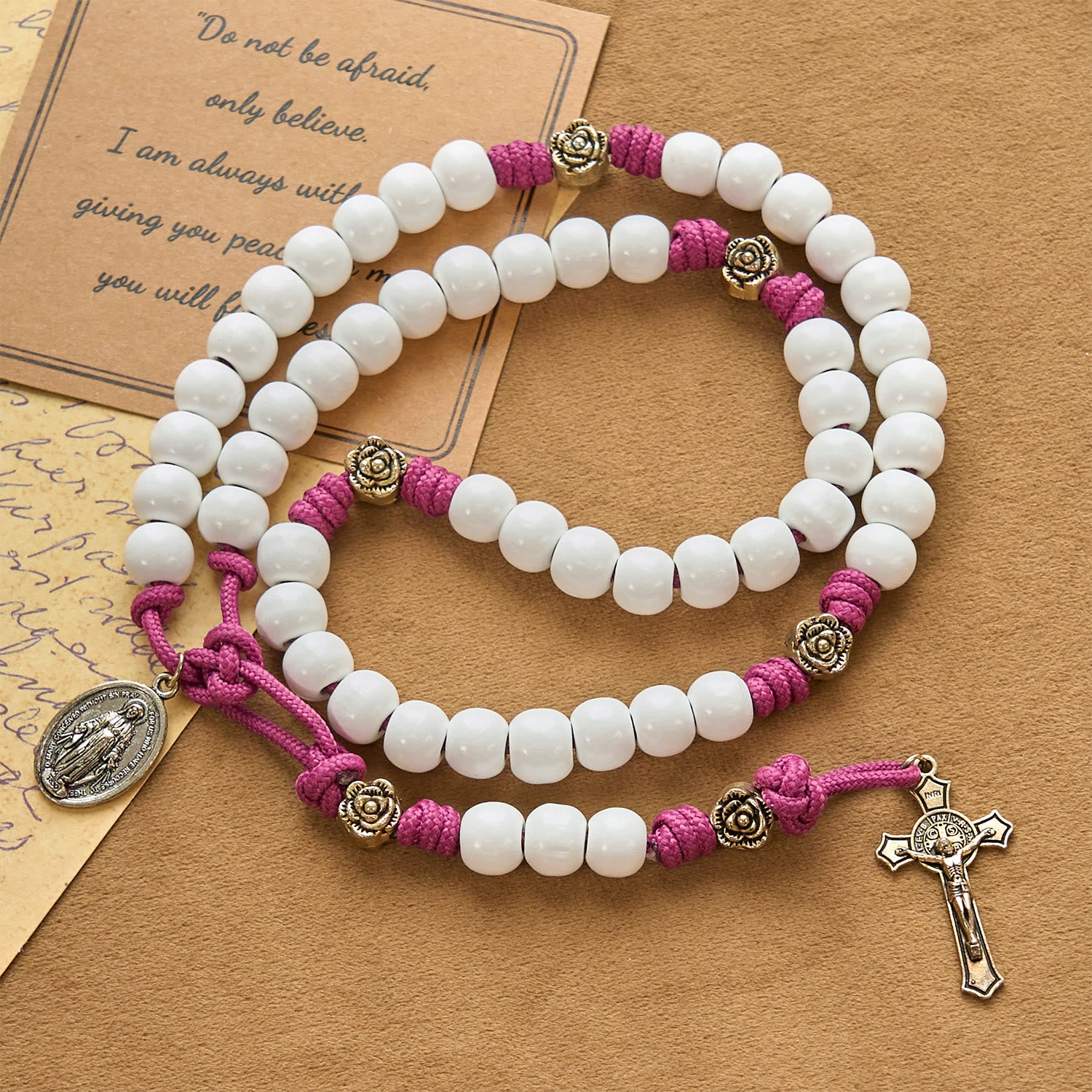 Feast your eyes on our Grace - Infused Rosary, a masterpiece that marries faith and artistry. The pristine white beads, reminiscent of purity and the light of God, serve as a canvas for your prayers. Each bead is a step on your spiritual journey, a reminder of the unblemished love of Jesus and the sanctity of your devotion. Interwoven with delicate pink cords, this rosary is not just a religious item, but a visual testament to the beauty that lies within the Christian faith. -