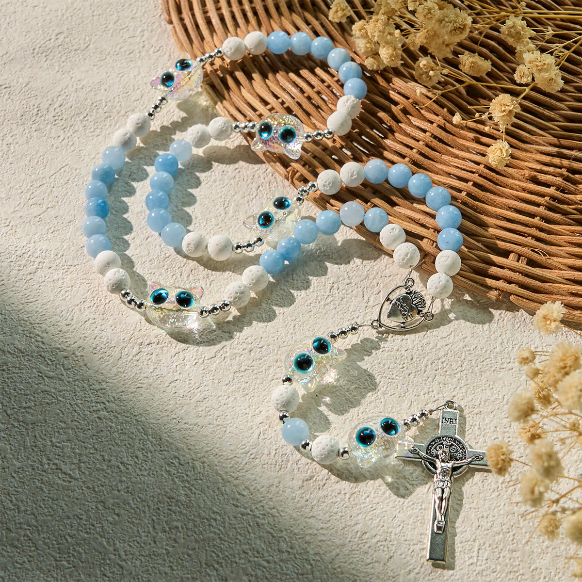 The gentle blue and white beads evoke the peace of Heaven, while the shimmering kitty accents symbolize the innocence and beauty of God’s creation, echoing the truth that all life is precious in His eyes.