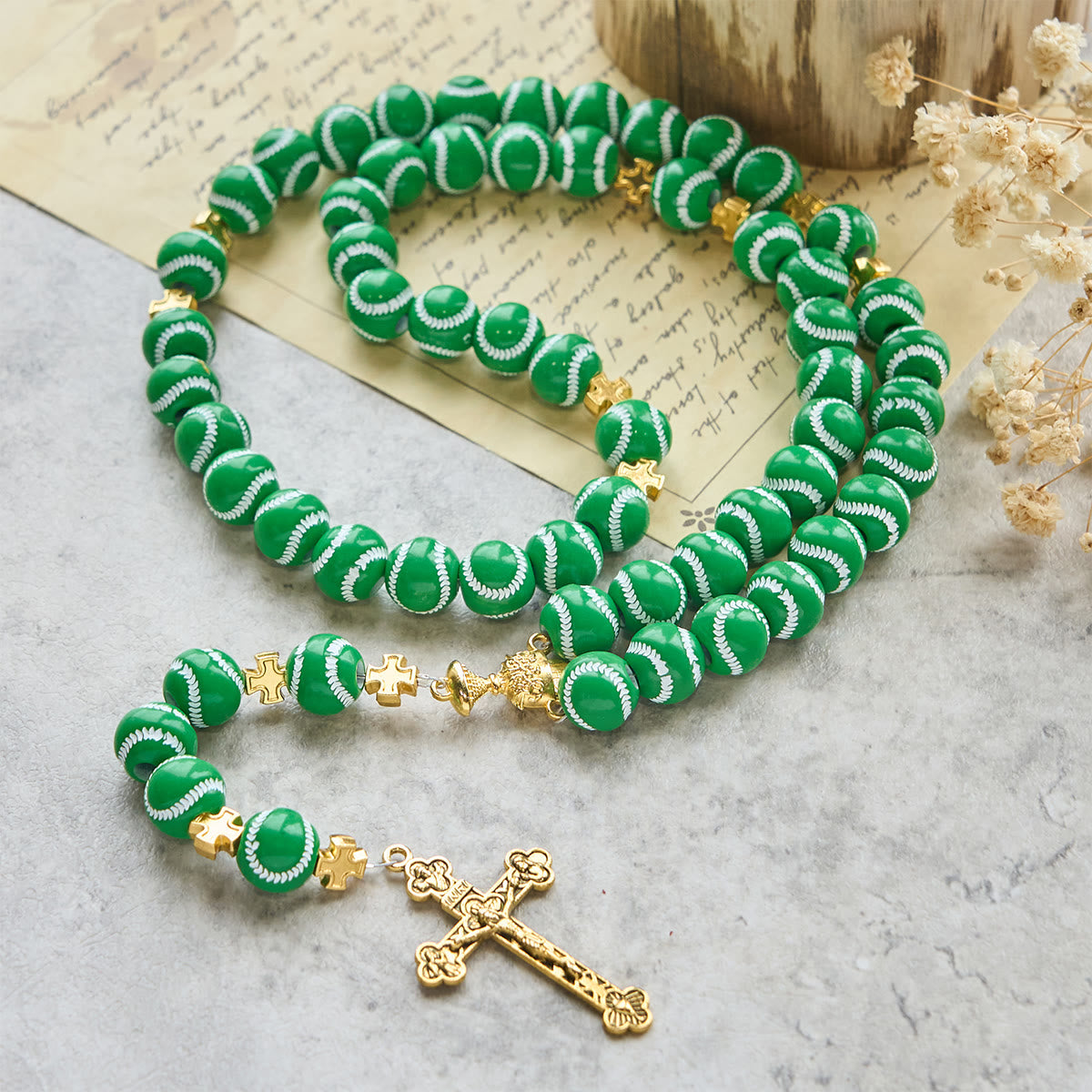 This is a compact, powerful symbol of faith tailored for athletes and sports lovers. Featuring mini baseball-patterned beads and a golden Holy Chalice and Crucifix, this rosary bridges the love of the game with the strength of prayer. -