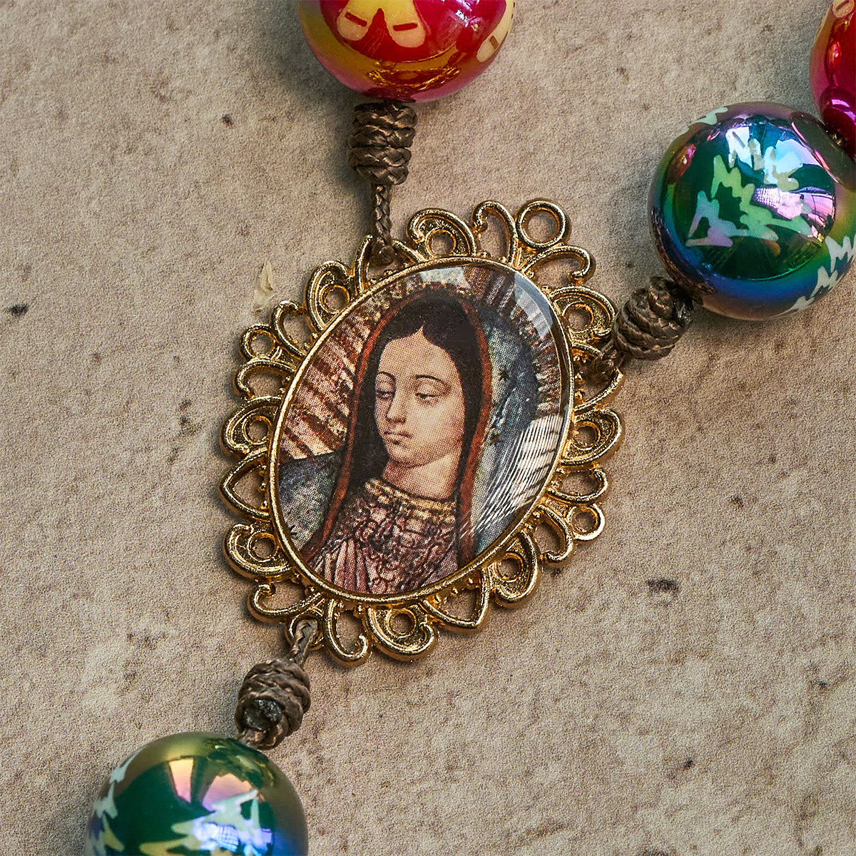 This pocket rosary gathers bold red-green holiday beads with golden accents, an Our Lady of Guadalupe center, and a vintage crucifix—made for on-the-go Christmas prayer. -