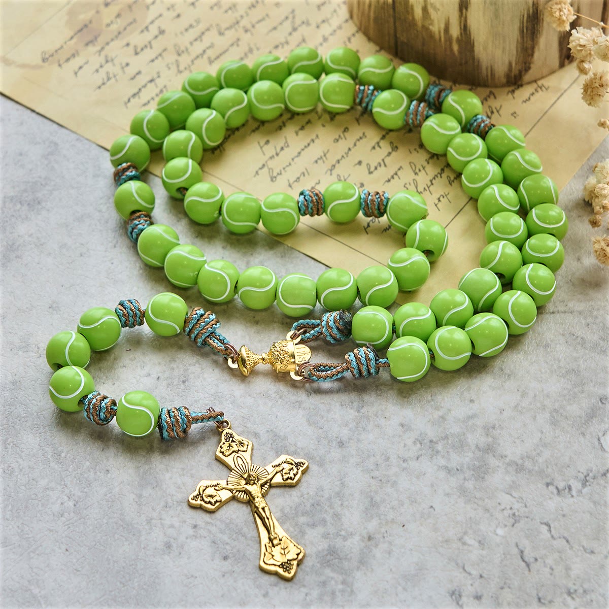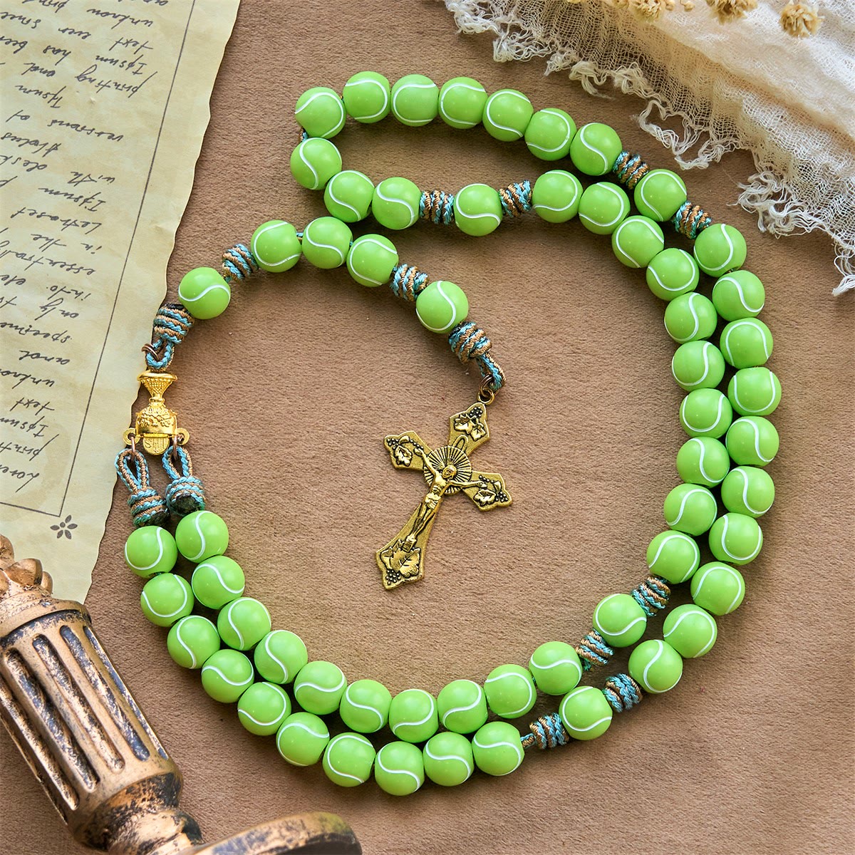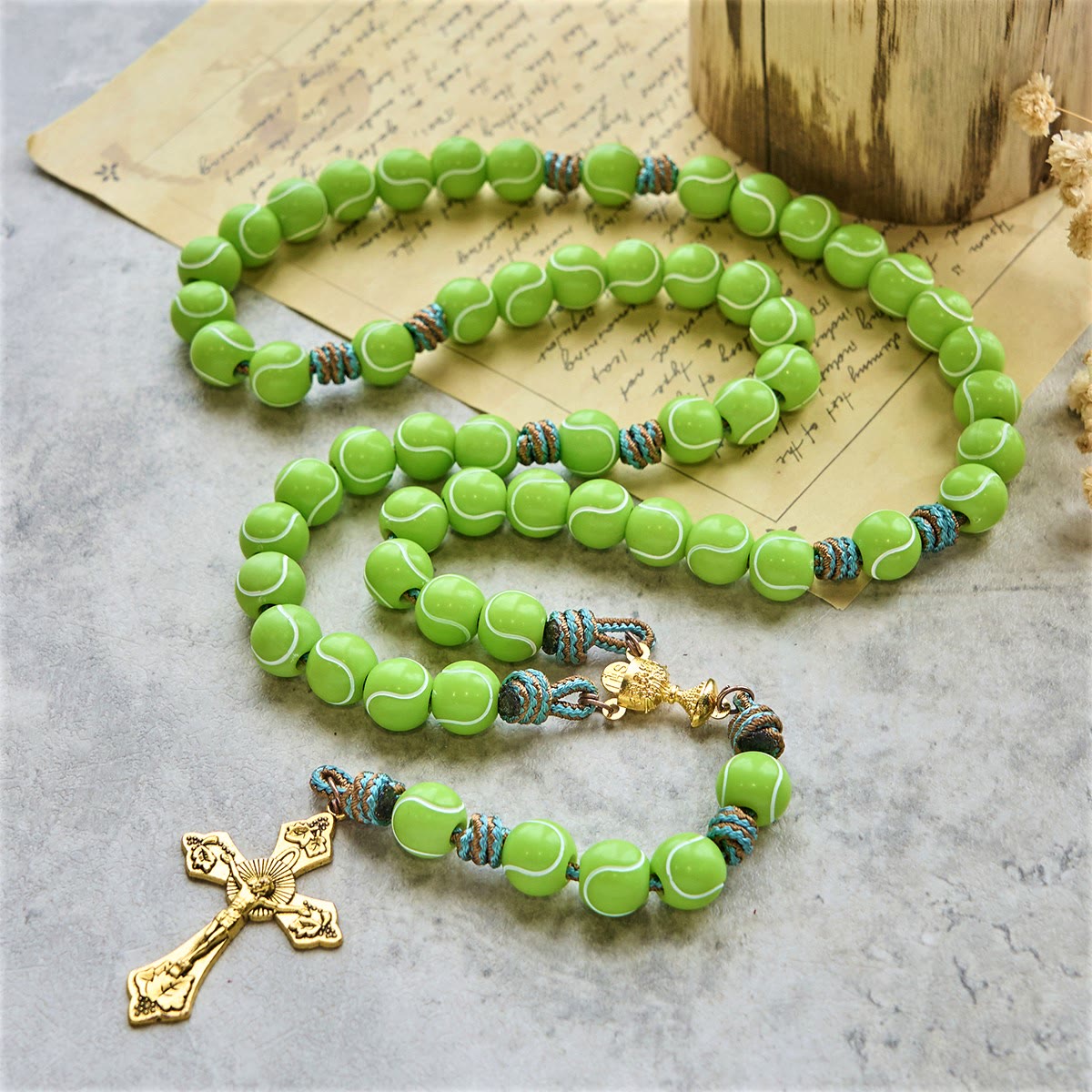 Vibrant green beads shaped like tennis balls create a lively, athletic theme. Paired with golden sacred elements, the design balances playful energy with solemn faith symbolism.