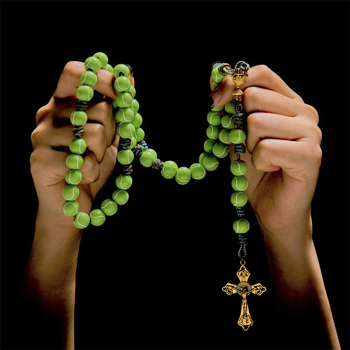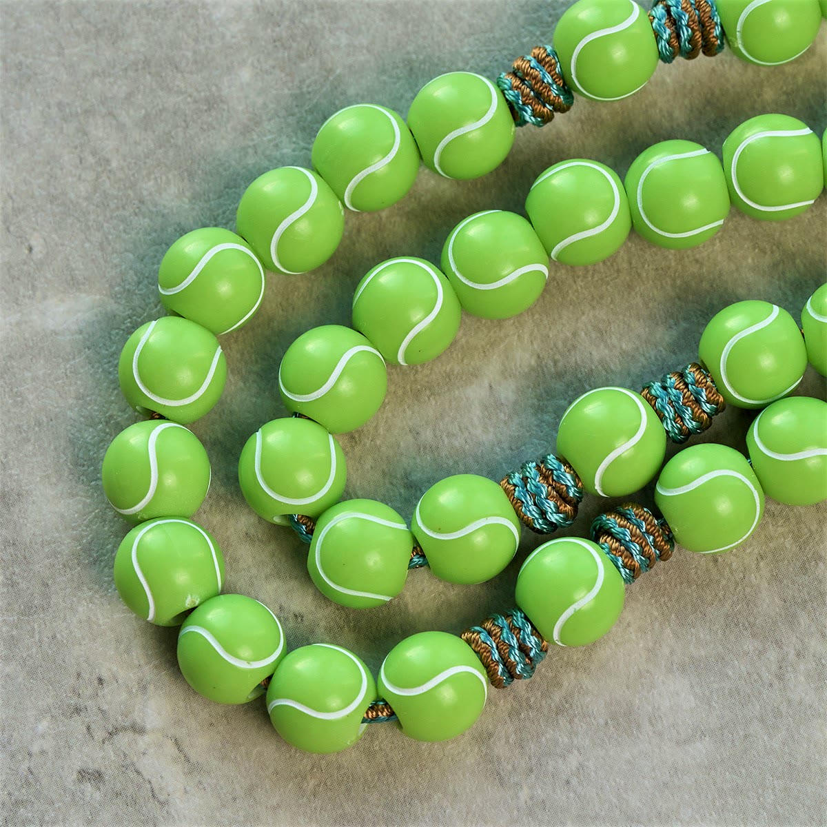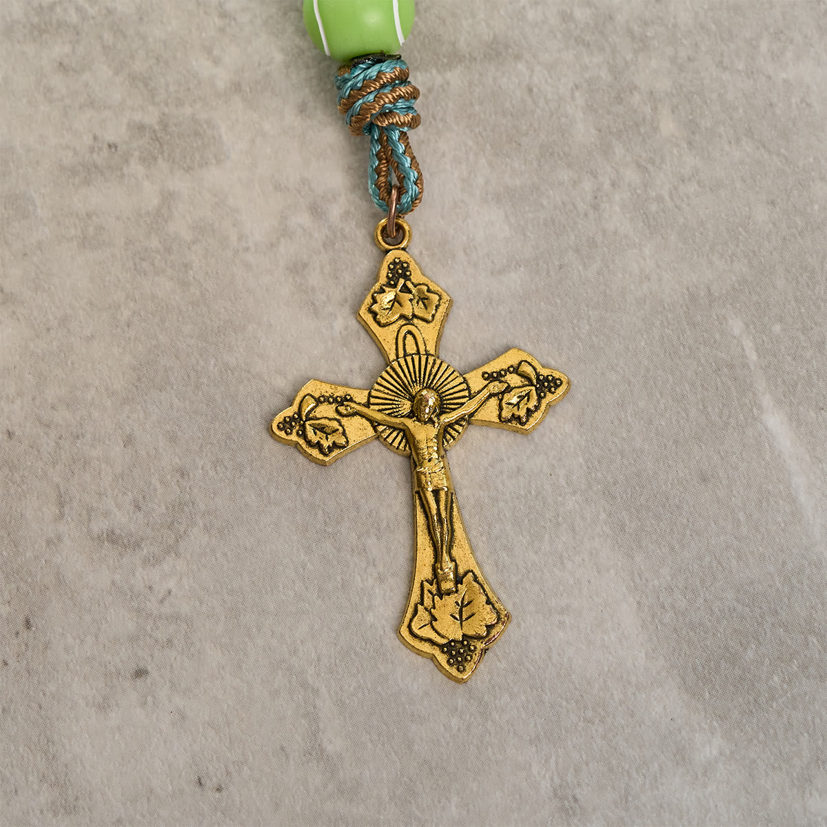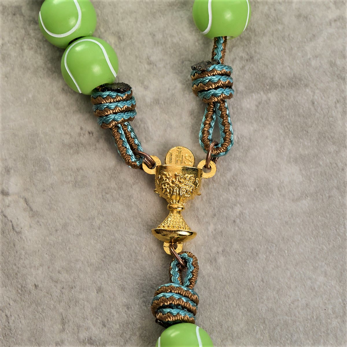 Vibrant green beads shaped like tennis balls create a lively, athletic theme. Paired with golden sacred elements, the design balances playful energy with solemn faith symbolism.
