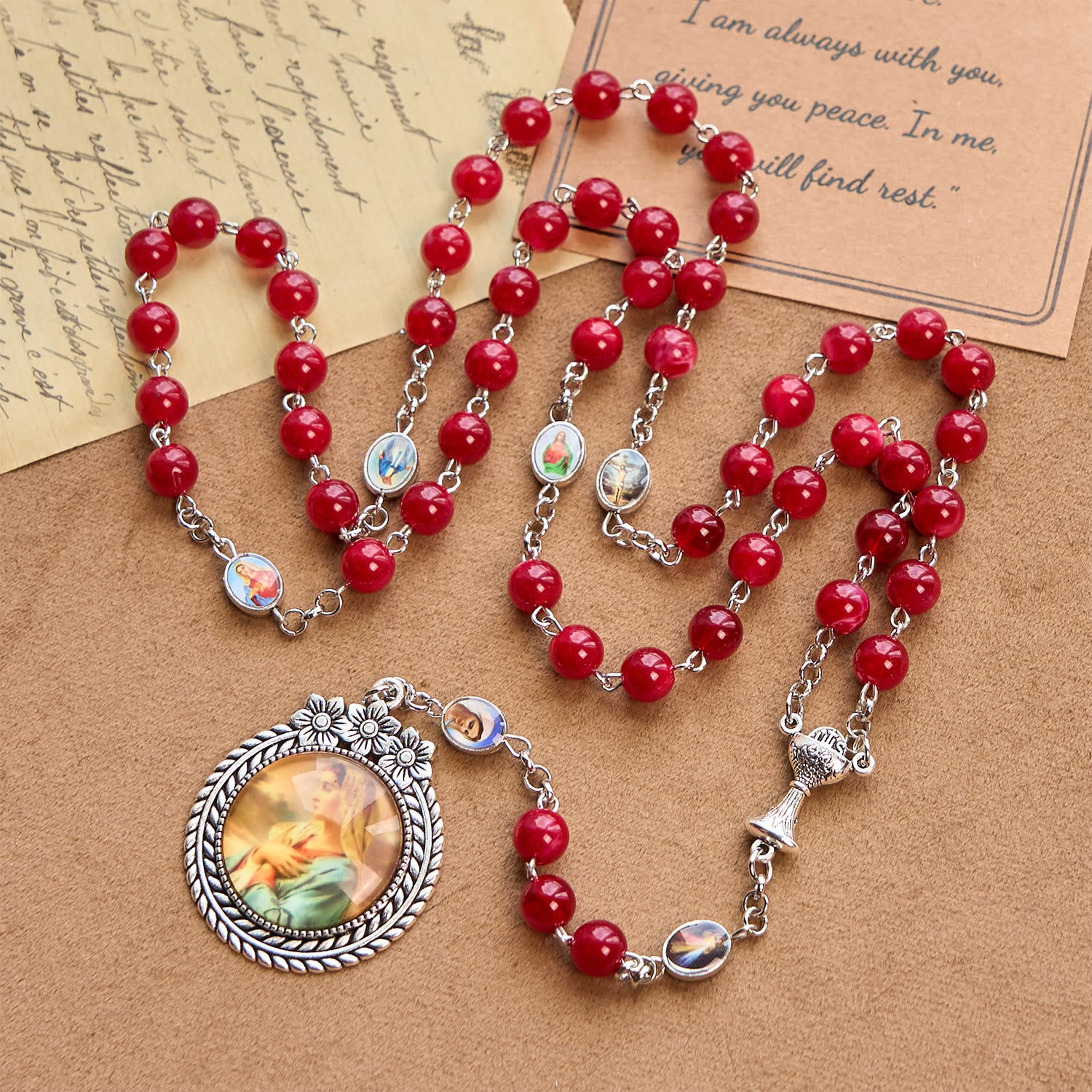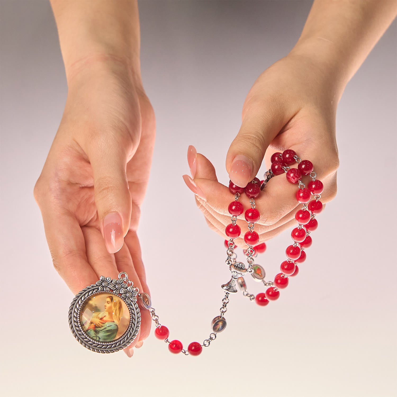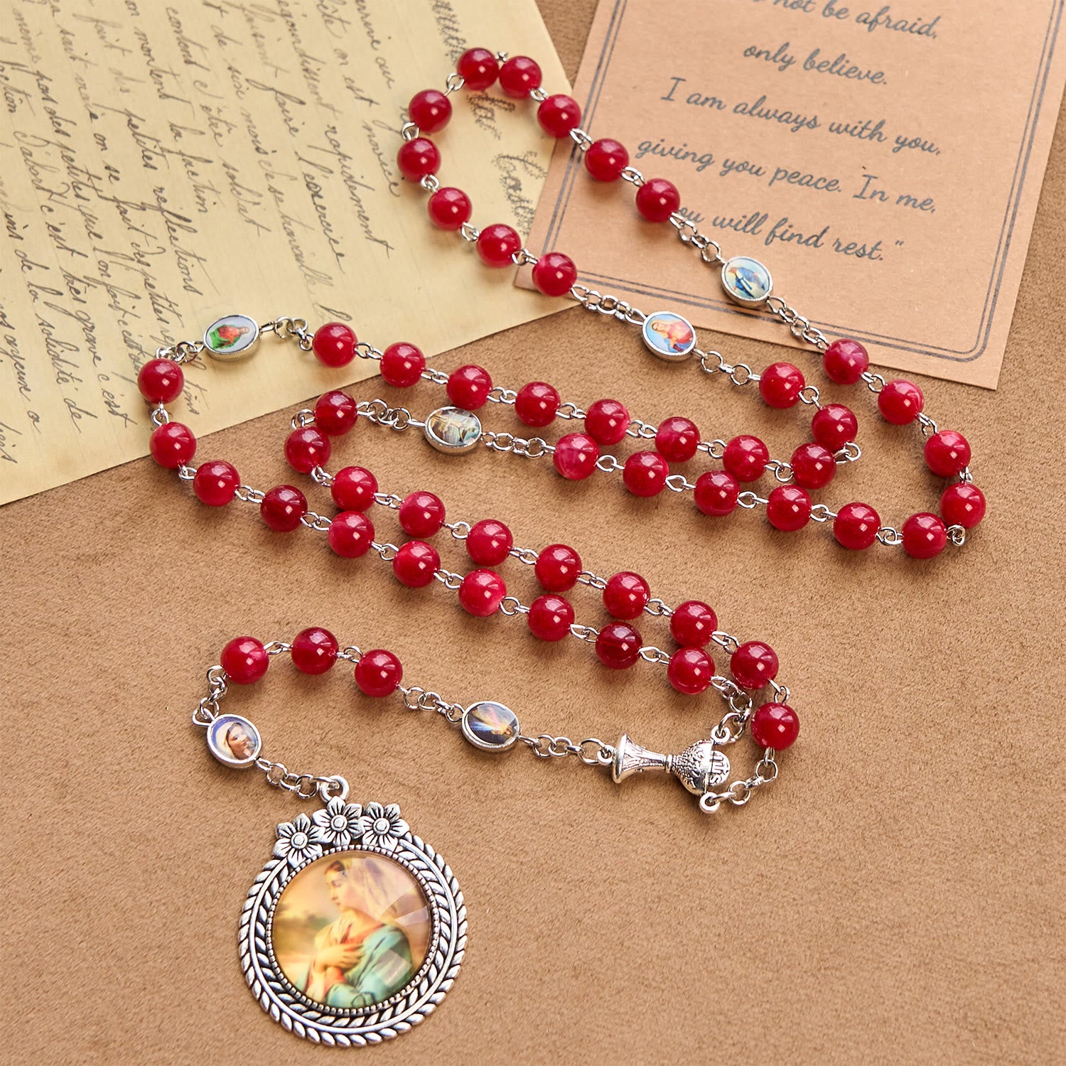 This rosary embodies deep devotion. Rich burgundy 8mm beads exude a mysterious luster, threaded upon a delicate chain. Centered by a finely flower-carved Our Lady medal and the Holy Grail emblem, it weaves reverence into every detail. -