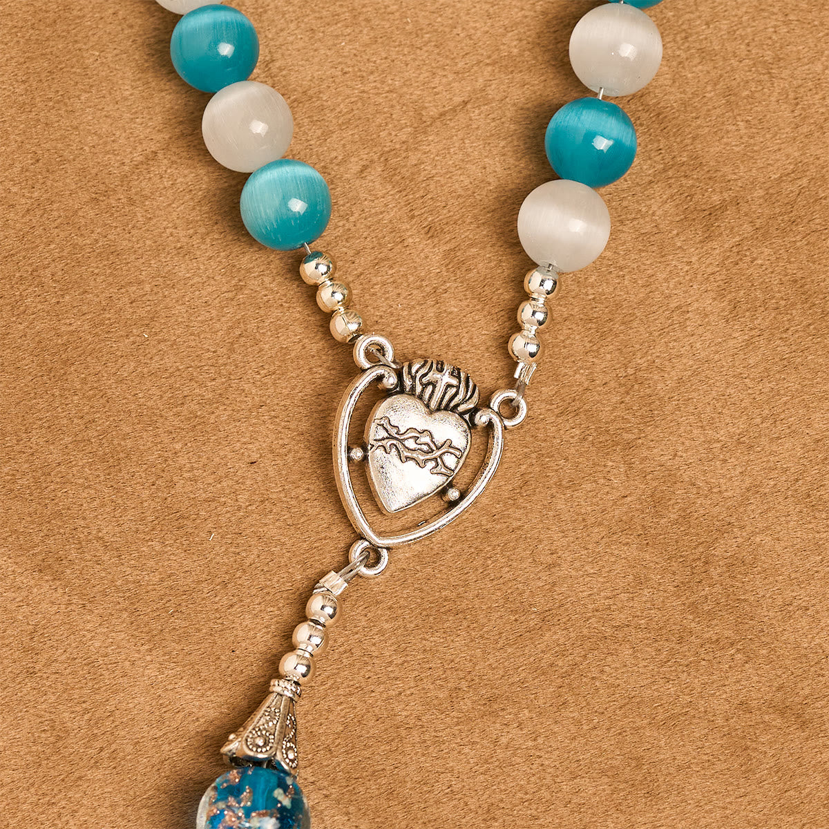 Glittering Cat's Eye Stone & Blue Star Glass Rosary with Sacred Heart