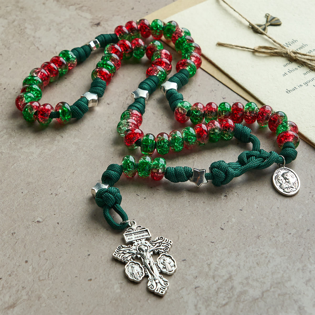 Glossy red–green beads, knotted cord sections, star accents, a Holy Family center, and a vintage crucifix—crafted for joyful, steady prayer all season long. -