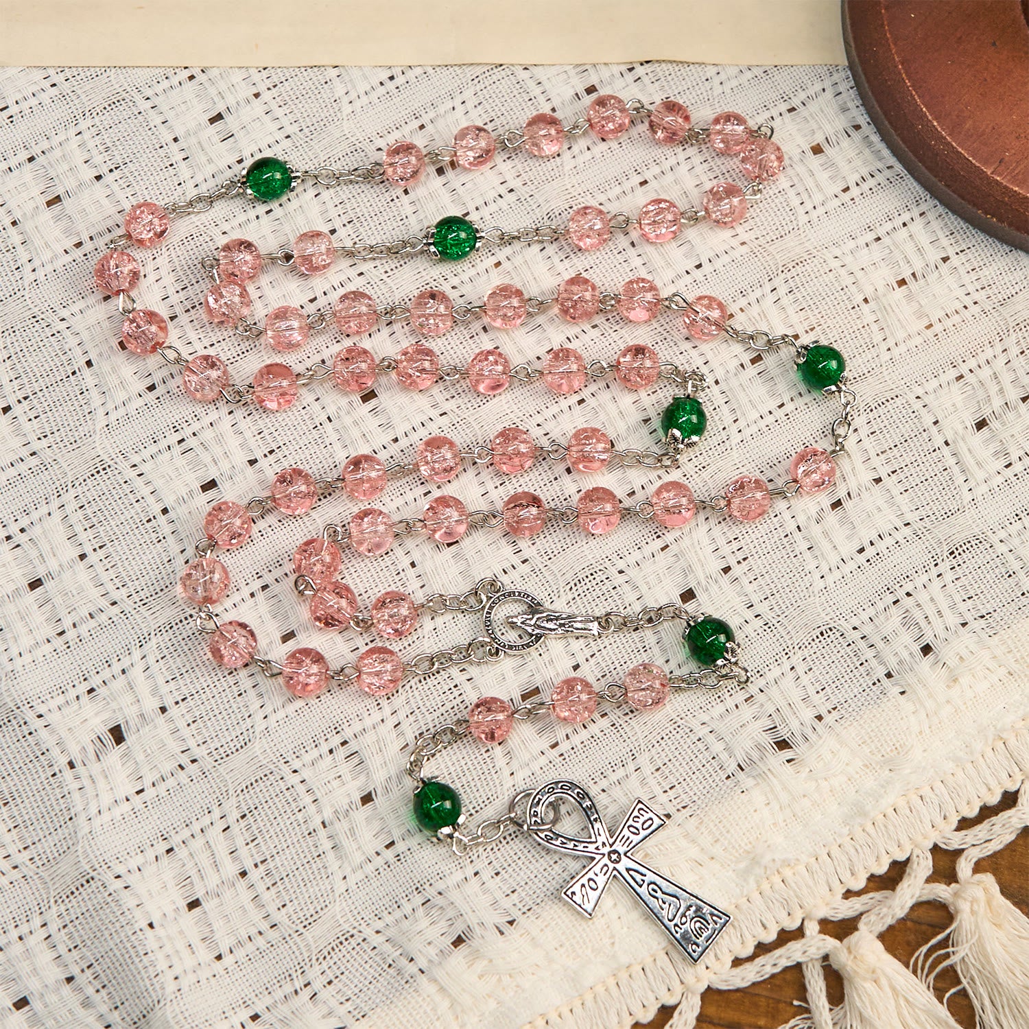 Inclusive Clear Sparkling Pink Glass Beads Alloy Chain Rosary with Our Lady & Ankh Cross