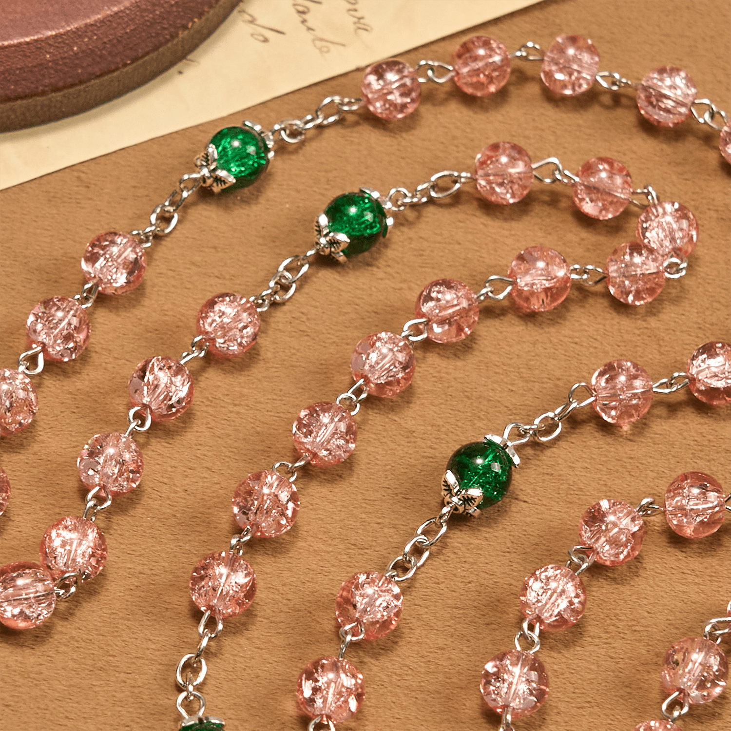 Its smooth beads guide quiet devotion. Worn daily, the soft pink sparkle and metallic shine add a touch of modern, graceful faith to any look. -