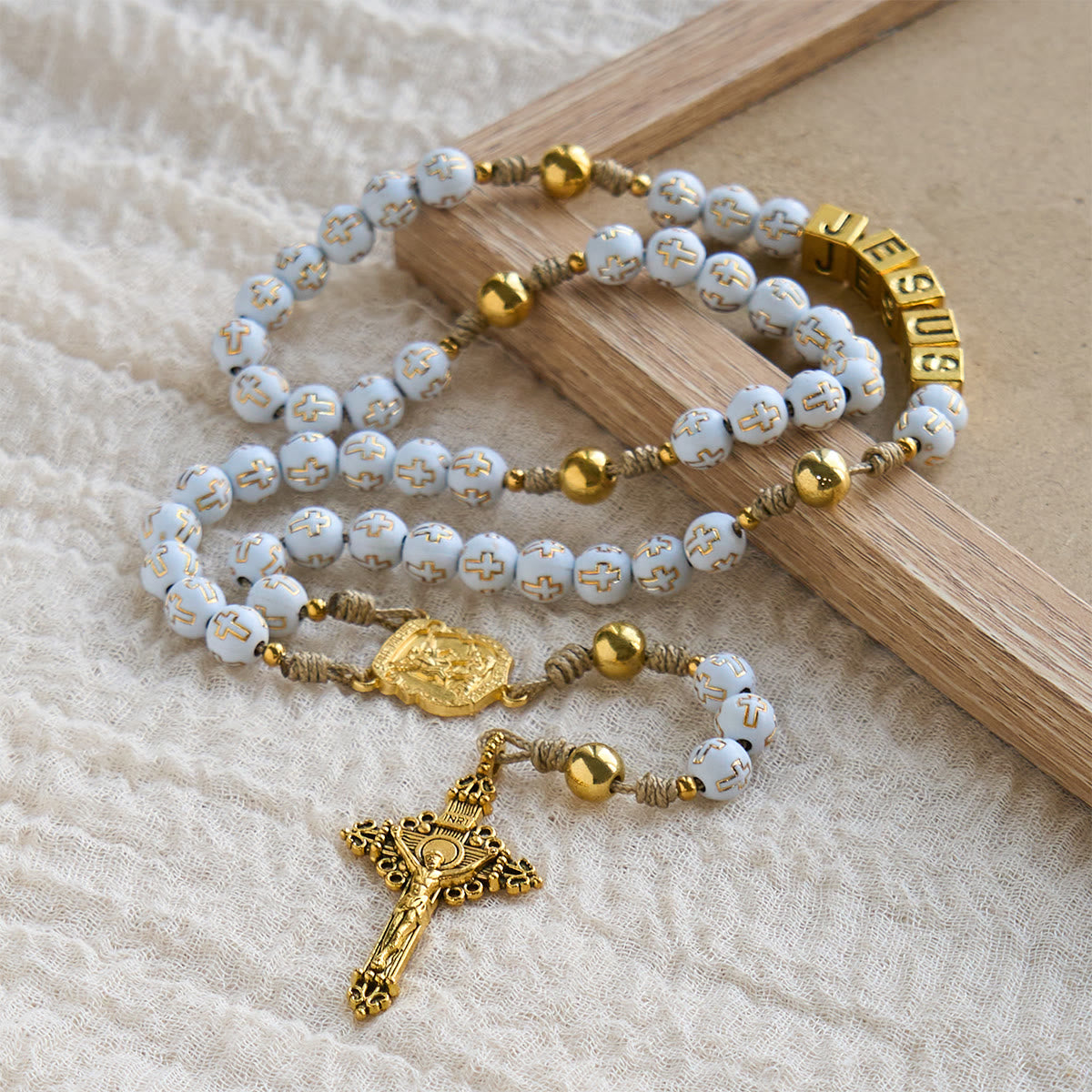 This five-decade rosary pairs ivory beads marked with golden crosses, a bold JESUS letter accent, a St. Michael medal, and a radiant crucifix—made for confident daily prayer. -