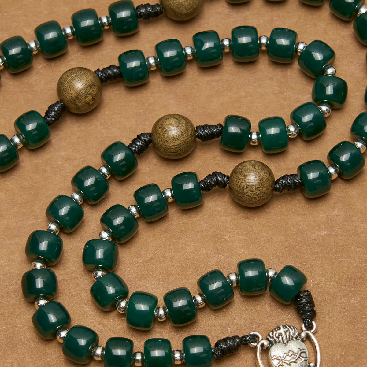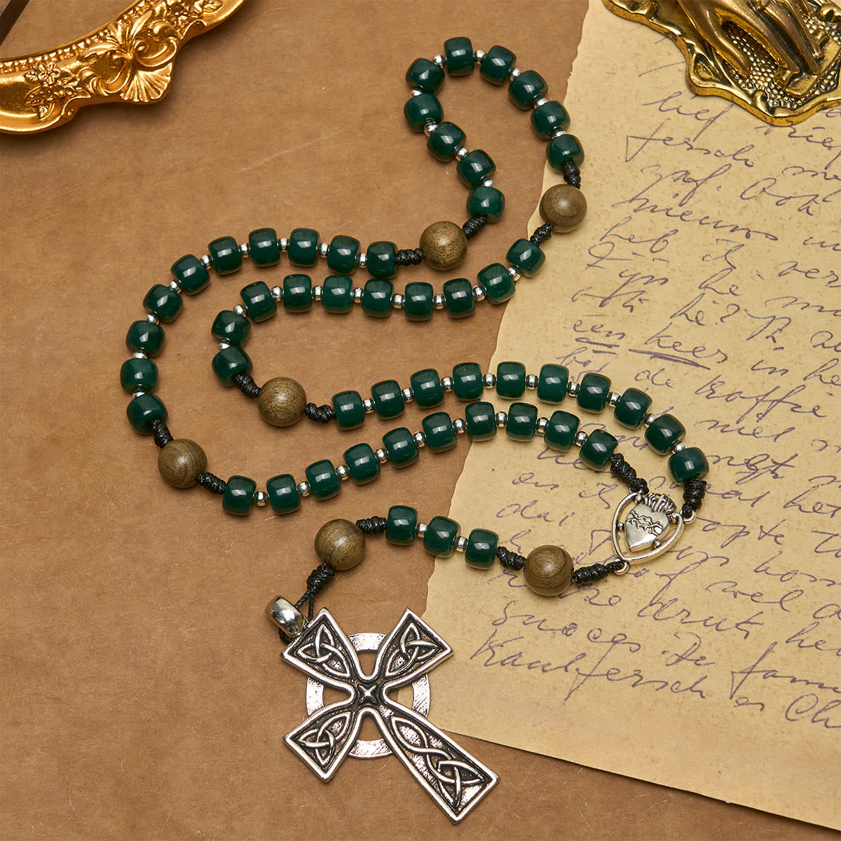Earthy matte green cube beads offer clean lines, flowing to the Sacred Heart of Jesus medal and intricate Celtic cross—a timeless fusion of divine protection and ancient spirit. -