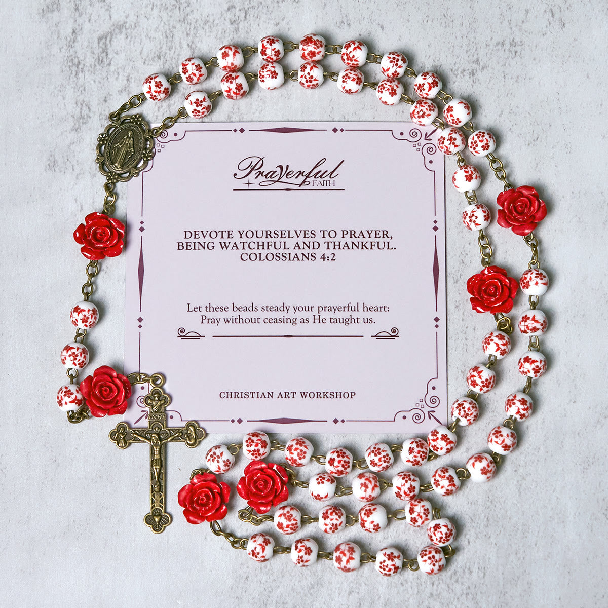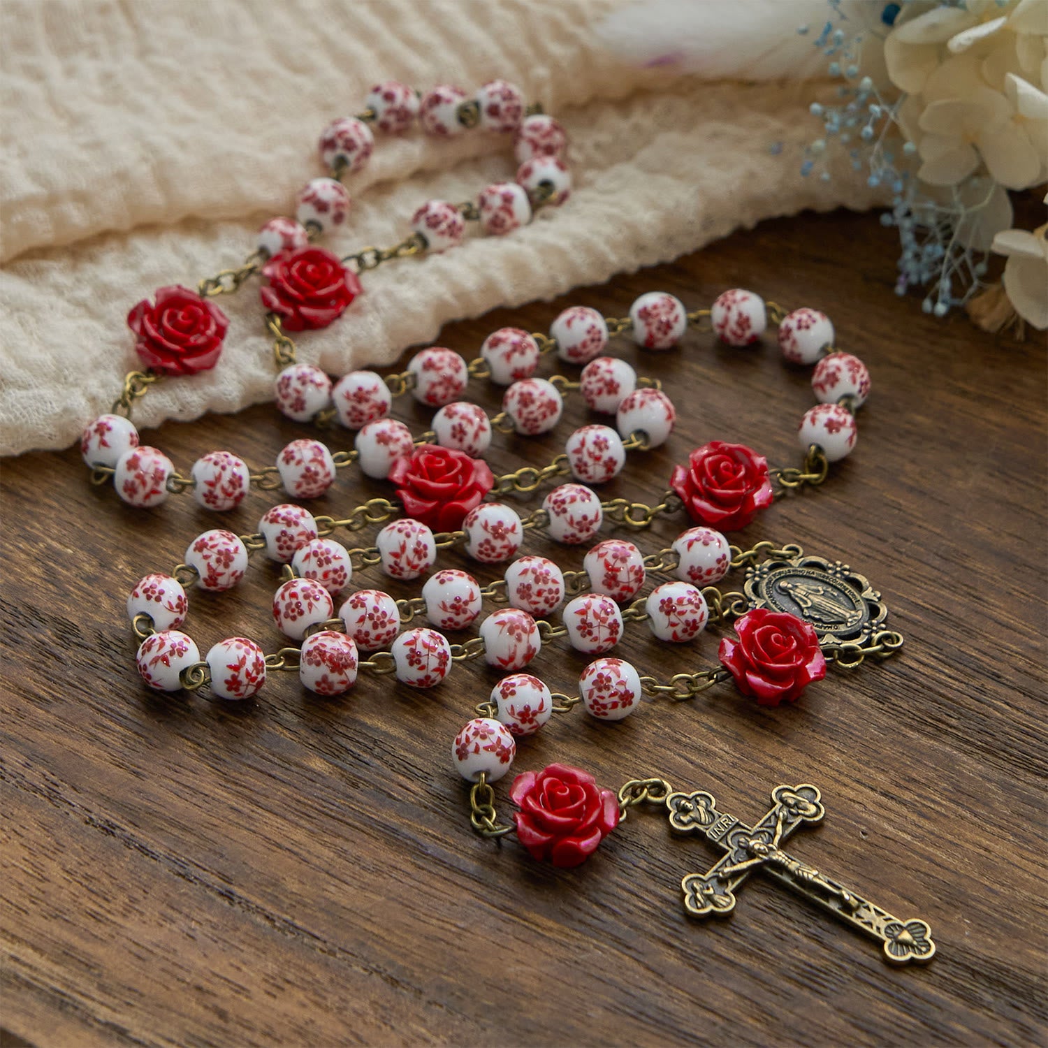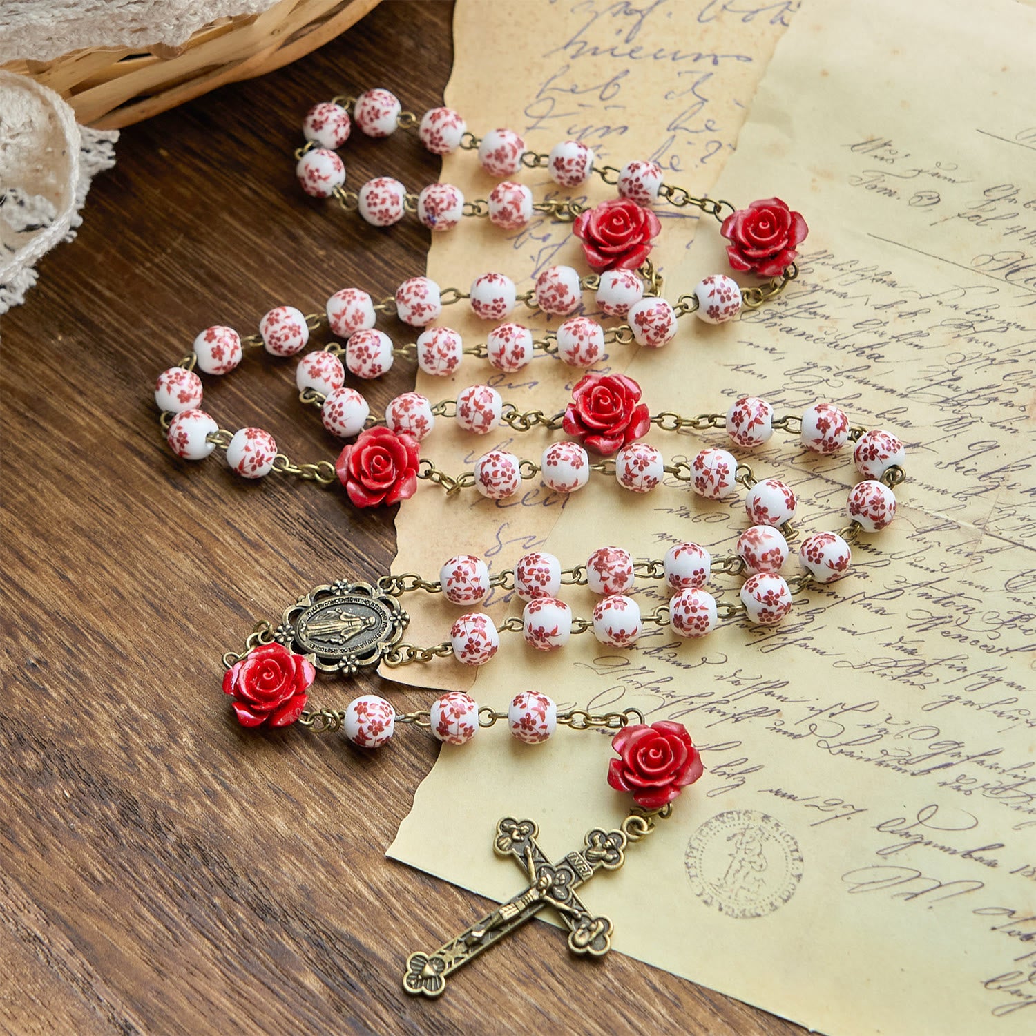 Miraculous Medal & Crucifix of 8mm Ceramic Beads & Rose Cinnabar Beads Handmade Rosary