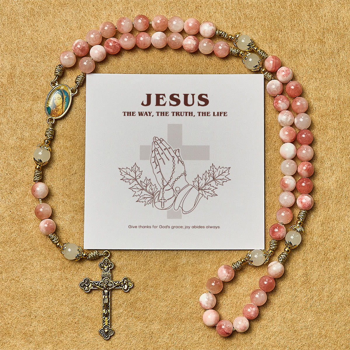 Soft pink glossy beads entwine with golden accents, centered by an Our Lady charm for divine grace. -