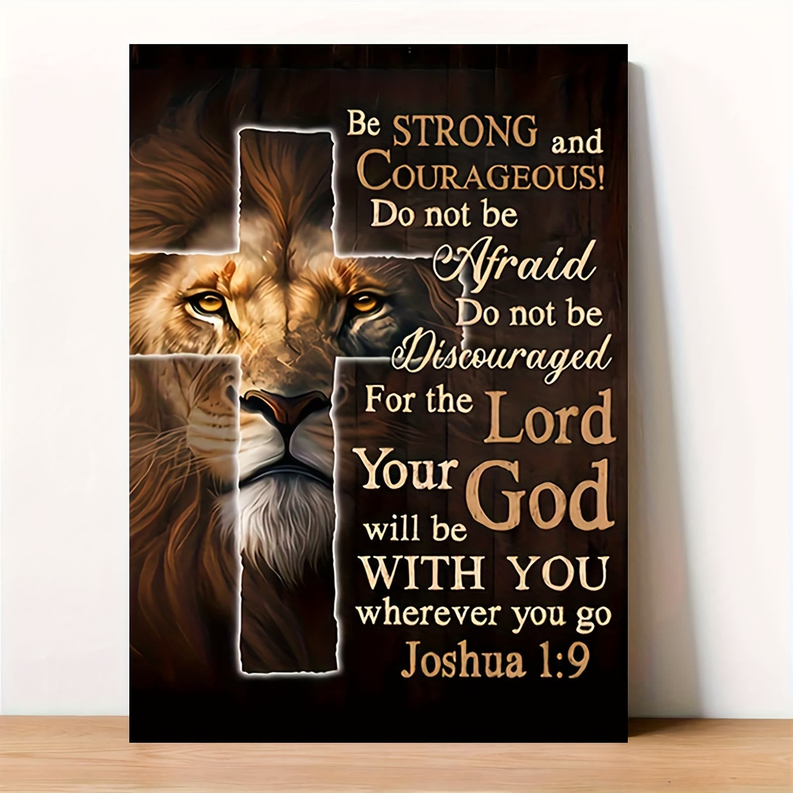 This canvas print merges a lion’s quiet strength, cross symbolism, and the verse of Joshua 1:9 — pairing steadfast courage with artful depth to create a stirring companion for home spaces. -