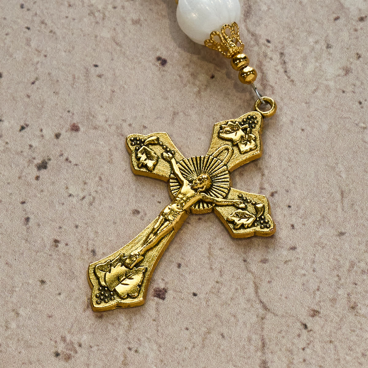 The detailed golden crucifix proclaims Christ’s sacrifice, anchoring your devotion and deepening reflection on salvation with every bead. -