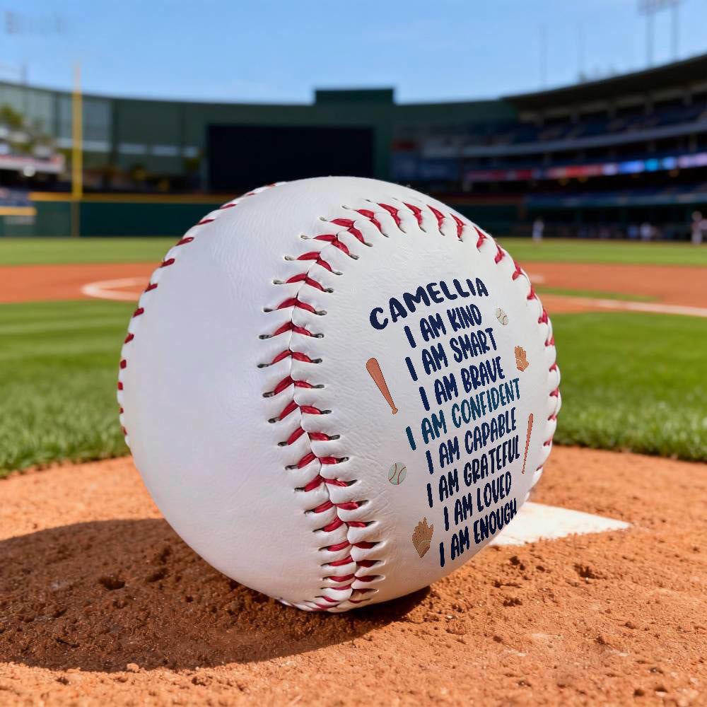Crafted with durable leather and bold red stitching, this baseball bears personalized affirmations like “I am loved, enough” — echoing the truth of being valued in God’s sight. -