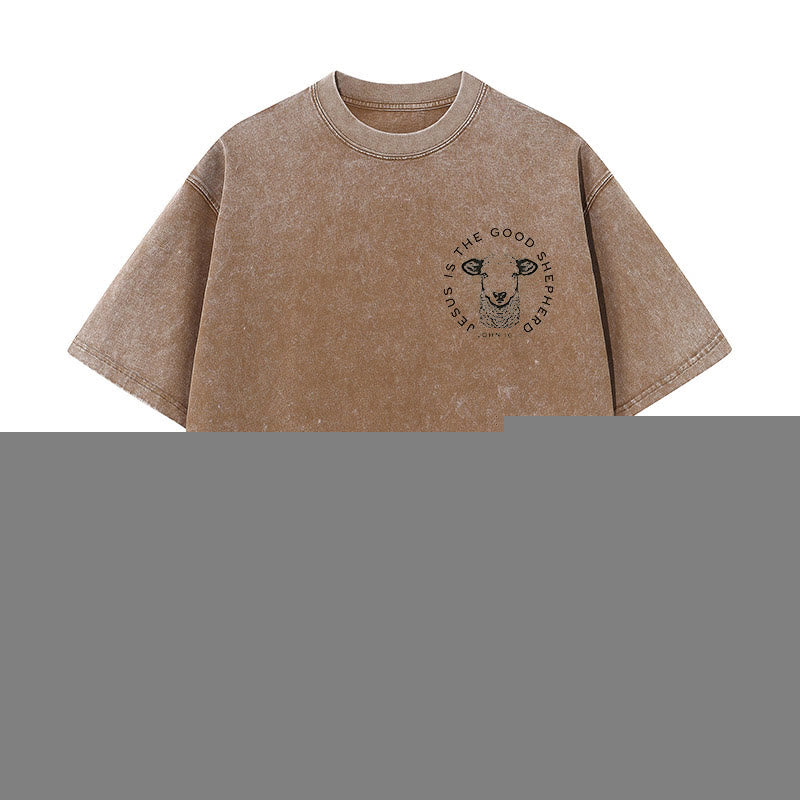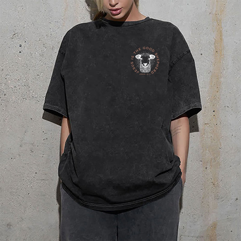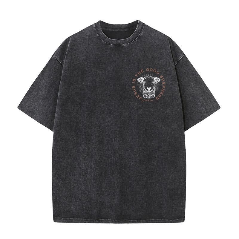 This black, vintage-washed T - shirt is a testament to faith and style. The front features a small, subtle graphic of a sheep's head encircled by the words “JESUS IS THE GOOD SHEPHERD”. The back is where the design truly shines. A detailed sheep's head graphic is surrounded by the inspiring text “HE LEFT THE 99 TO RESCUE ME” from Matt. 18:12. Below, “JESUS THE GOOD SHEPHERD” is emblazoned in bold letters, a powerful reminder of Jesus' care and sacrifice.